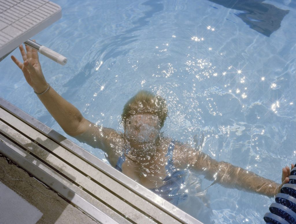 La série que Caroline Tompkins a tirée de ce séjour, intitulée Barracudas, déploie une esthétique joyeuse, intime et intuitive, dont elle garde encore la trace aujourd’hui. Bien loin des rigueurs des séries et de l’esprit de compétition, elle observe les usagers avec un regard qui mêle humour et tendresse. Travaillant principalement à l’argentique pour ses projets personnels, l’artiste estime que la photographie n’est qu’un prétexte, une autorisation pour être présente dans certaines situations et raconter une histoire. En l’occurrence, ce que la nage a d’enfantin, et ce qu’est, aussi, la piscine publique : un terrain de jeu.