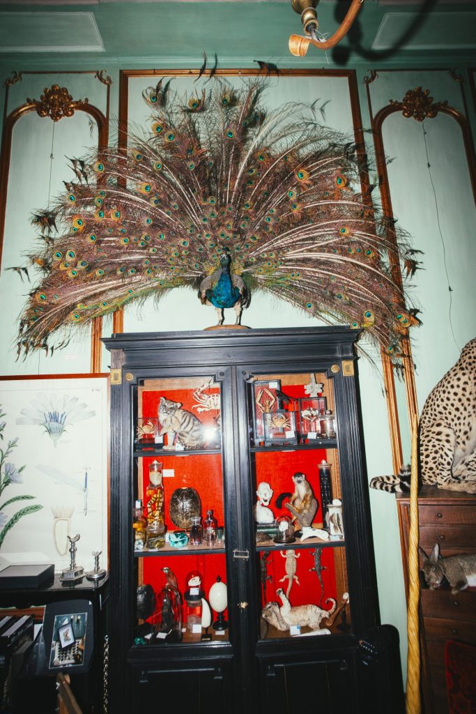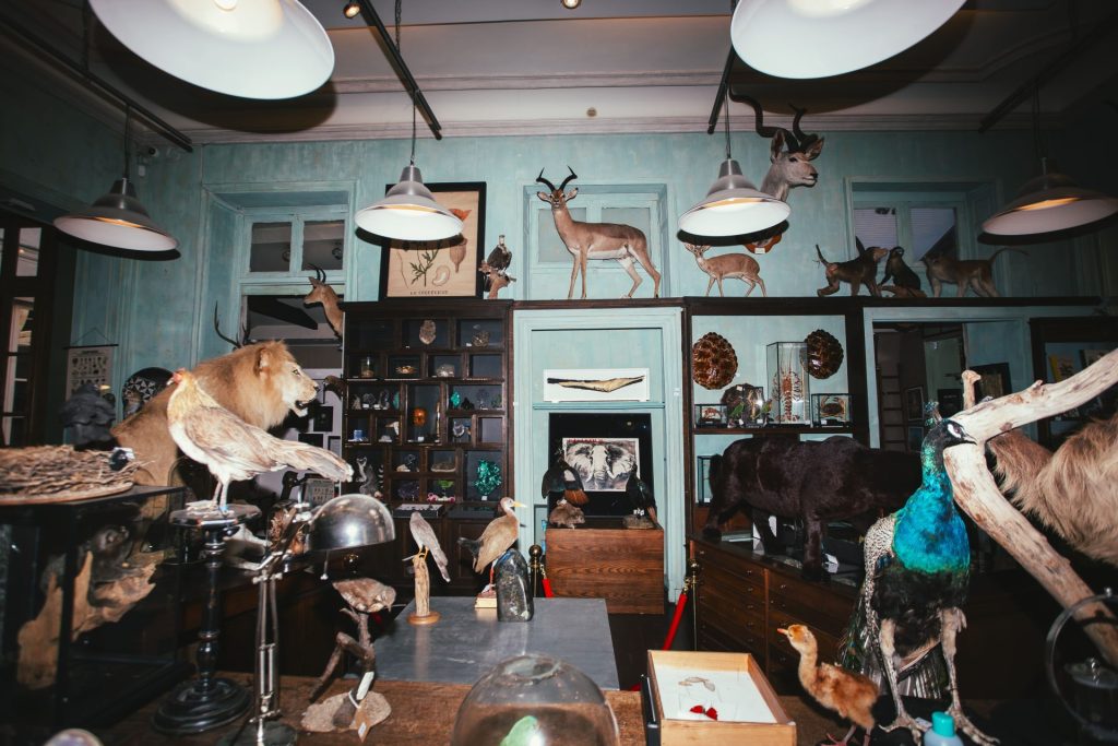 Dans cette institution parisienne, qui se définit comme un cabinet de curiosités, quatre grandes salles en enfilade regorgent d’animaux naturalisés. On y circule comme dans un muséum d’histoire naturelle, au son des grincements du parquet, et avec l’envie de faire partie d’une société savante du XIXe siècle, de nommer des espèces par leur nom latin, de dire des phrases qui commencent par « mon cher confrère ». Des vitrines vieilles de deux siècles contiennent des œufs d’autruche, des poissons séchés, un nautile, des coquillages. Dans certains meubles en chêne massif, il y a des carapaces de tortues finement polies, un homard aux reflets bleus. Une petite armoire, non loin de l’escalier, attire l’œil par sa discrétion et son étrangeté. « Elle contient des choses un peu bizarroïdes », explique Thomas Block, directeur du département de taxidermie et de curiosités. Dedans, une canine de cachalot, un boa constrictor plongé dans un bocal, des batraciens diapharisés (chairs invisibilisées et squelette coloré), ou encore un lionceau sur le dos, figé dans une position de jeu.
