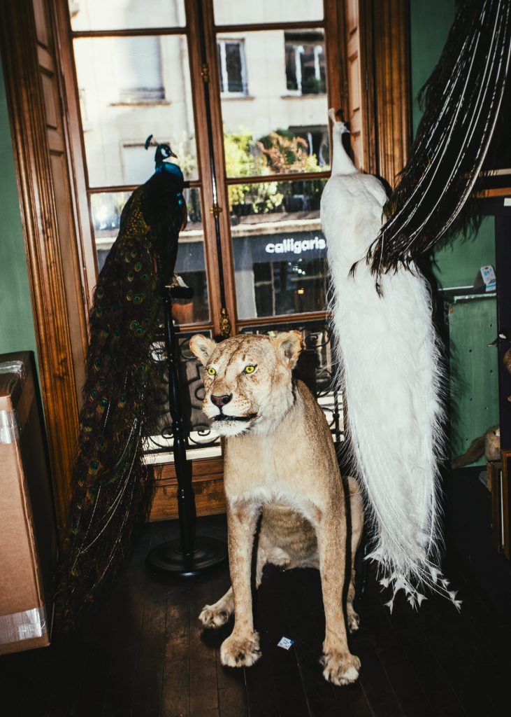 « Je cherche un âne », annonce un trentenaire. « Moi, un porc-épic », répond son acolyte. Impossible de dire s’ils rigolent ou s’ils sont sérieux. Le ton semble plus sincère lorsque l’un d’eux lève un index et dit : « Le zèbre, là, il tue ! » Et encore, ils n’ont pas tout vu. Mais déjà, dans cette première pièce à l’étage du magasin Deyrolle, le regard se perd : c’est le festival des animaux. Un agneau repose sur un canapé de velours rouge. À ses pieds, un renard s’étire. Tout autour, on peut voir un lion en majesté, un tigre sur une commode, un manchot pygmée perché sur un buffet. Pour ne citer qu’eux.