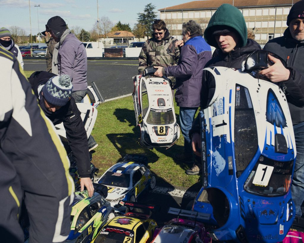Dans le taxi, pourtant vitres closes et distant d’une bonne centaine de mètres du circuit, un bruit aigu de moteurs qui montent dans les tours parvient déjà aux tympans. Il fait 2°C à peine malgré un grand soleil, et un vent glacial souffle en continu. Une trentaine de personnes bravent pourtant le froid, debout sur le bord de piste. Recroquevillées dans leur manteau, sourcils froncés sous leur bonnet, elles suivent des yeux neuf bolides miniatures, qui filent dans les virages à plus de 50 km/h. Leurs pilotes, campés sur une estrade qui surplombe la piste, les dirigent à l’aide d’une radiocommande complexe, la main droite sur une gâchette qui sert d’accélérateur, la main gauche sur une molette qui sert de volant. Tous ou presque ont le nez qui coule, mais pendant les dix minutes que dure chaque course, pas un ne prend la peine de s’essuyer le visage. Risquer de perdre quelques dixièmes de seconde ? Impensable. Ce dimanche 26 février, à Neuville-de-Poitou, non loin de Poitiers, on dispute la première manche d’une compétition nationale. Certains ont fait le déplacement depuis la Bretagne, Nantes, Paris ou Grenoble. Tous sont ici pour gagner.