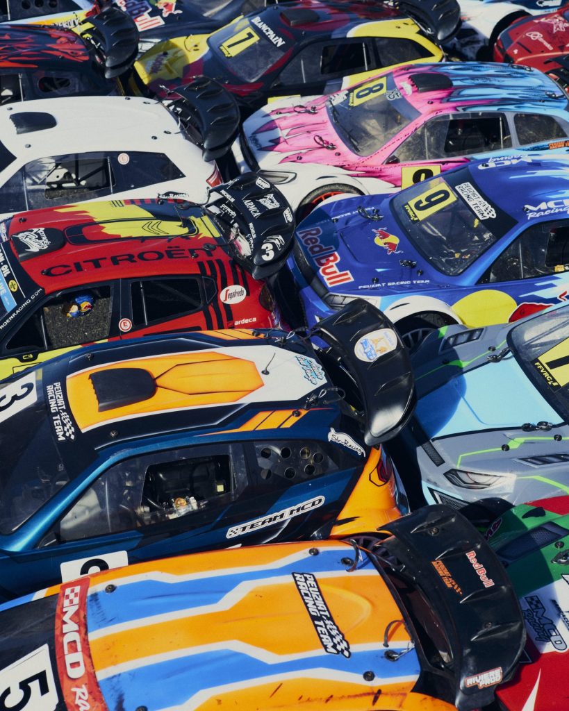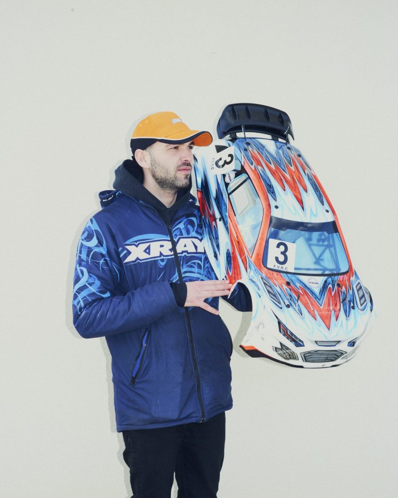 Au terme d’une course ponctuée de deux sorties de piste et d’un joli tonneau, le ton monte dans les stands, où flotte une lourde odeur d’essence. Untel aurait trop coupé dans les virages et conduit comme un «bourrin », sans se soucier d’une éventuelle casse. Ce qui n’est pas dans les habitudes. « Sur la piste, ça court, c’est viril, mais ça se respecte quand même, abonde Valentin Peuziat. Les voitures sont trop chères pour faire les cons. » Celle du Nantais de vingt-sept ans a elle-même eu un accident lors de son avant-dernière course. Ce qui n’empêchera pas le pilote de participer à la dernière. Tout en retapant son bolide, les mains pleines de cambouis, il explique s’être pris de passion pour les modèles réduits vers quatre ou cinq ans. C’est son père, également présent sur place et multiple champion de France, qui l’a initié. Valentin Peuziat, en plus de reprendre le flambeau, en a fait son métier. Champion d’Europe et multiple champion de France en tout-terrain 1/5, il a fondé en 2016 VP Design, sa propre entreprise de personnalisation de carrosseries miniatures. Elle compte aujourd’hui plusieurs centaines de clients, qui paient ses peintures à l’aérographe entre trente et quatre-cents euros.
