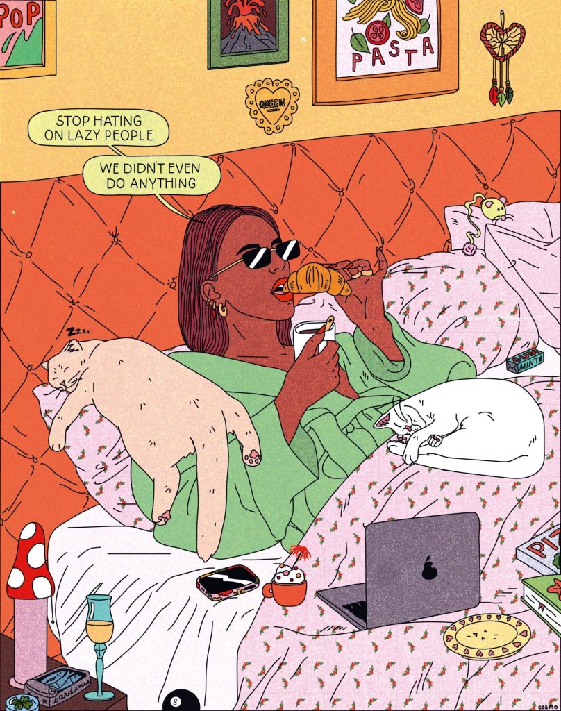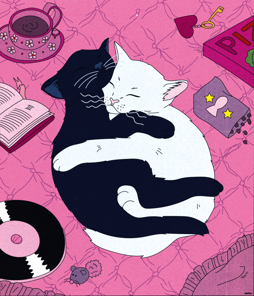 Dans son travail, visible sur son compte Instagram @cosmoillustrator, le chat se décline sous mille facettes. Personnage principal ou détail du dessin, il est tour à tour vecteur d’ironie, de malice et d’élégance, et incarne aussi bien la paresse que la lascivité, la distance que la proximité. Autant de nuances qui, pour l’artiste, font du chat une figure fascinante mais aussi féminine, en cela qu’elle représente à merveille la posture d’équilibriste que la société impose aux femmes : sensuelles mais pas trop, agressives mais pas trop, indépendantes mais pas trop.